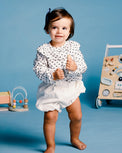 Bloomers Mini Tea è disponibile in velluto millerighe, flanella o plumetis. L’elastico in vita e interno coscia accompagna ogni movimento con dolcezza.